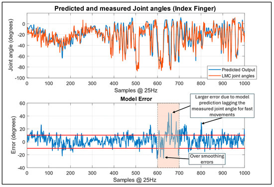 The data in Figure 15 and Figure 16 are created by taking the last output of the predicted output sequence and comparing it to the last value of the measured joint angle. In this case, the performance demonstrates the worst-case scenario of the model’s true performance, as no additional signal processing is undertaken. Despite this, the model accurately captures the major patterns visible in the LMC data. The errors from the model appear as noise signals from the model’s output or because of the time delay where the model can have difficulty in keeping up with the fastest movements of the fingers.