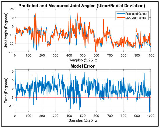 Model prediction performance based on data previously unseen by the model. Best-case performance on ulnar/radial deviation, with RMSE error band at 5 degrees highlighted in red.