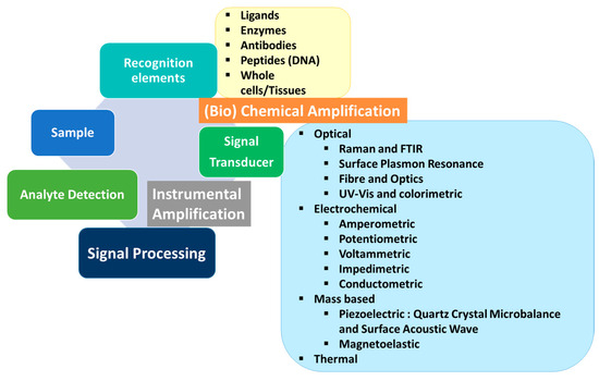 Biosensor components: recognition elements, transducers, instrumental and analytical amplification, signal processing, and analyte detection.