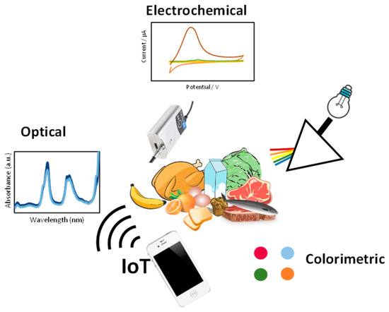 These types of sensors have been widely studied because they provide qualitative and quantitative safety data, minimize pretreatments, and use devices that do not require specialized personnel. As can be seen in Figure 2, the most widely evaluated are those based on electrochemical, optical, or colorimetric measurements. Moreover, their IoT connection combined with the rapid response of sensory devices can minimize human diseases, preventing consumers from buying and consuming unsafe food. Often, these sensors are targeted to a specific compound; however, universal sensors need to be developed to analyze multiple targets in one set. These types of sensor methodologies are named multiplexed sensors and they are the future of sensor development in food safety.