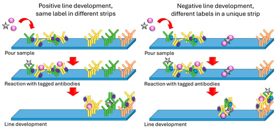 As stated before, many of the multiplex sensors for microorganisms or antibiotics are based on LFAs (Figure 3). Typically, these strips consist of four sections: a sample pad where the sample is poured and a conjugate pad containing antibodies against the analytes, labeled with an optically detectable mark (e.g., SERS probe or fluorescent tag). When the sample flows because of capillarity and reaches this zone, eventual antigens react with tagged antibodies and continue flowing as tagged antibody–antigen complexes. Then, there is a nitrocellulose membrane with immobilized anti-analyte antibodies which react with this labeled flowing complex, revealing a line. A second control line made of anti-IgG antibodies is usually incorporated, which will react with the labeled antibodies either if they reacted with their corresponding targets or not [9,20]. A similar although slightly different approach was used by Shi et al. in their multiplex sensor for neomycin and lincomycin in milk [10]. In this case, the test line was not prepared using anti-neomycin and anti-lincomycin antibodies but by immobilizing lincomycin and neomycin instead. In this way, if the sample does not contain the antibiotics, the antibodies present in the conjugate pad reach the test line and react with it, therefore creating a visible line. On the contrary, if the sample contains the antibiotics, they react with the antibodies so that they are not able to interact with the immobilized antibiotics on the test line, resulting in no visible line. In this case, the amount of antibiotics is inversely proportional to the intensity of the revealed test line.