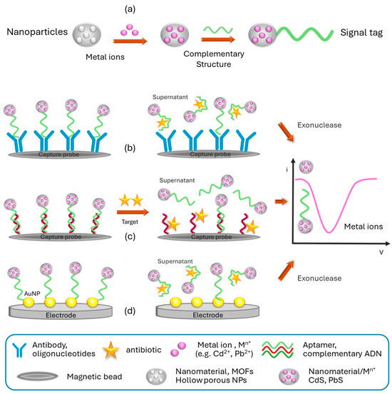 Schematic electrochemical analysis systems for the detection of ultratrace levels of antibiotics, utilizing metal ions/nanoscale materials as distinctive markers, serving as tracers of the analytical signal (SWV). (a) Signal tag preparation. (b–d) Three different approaches. In the label, several examples are provided to represent the different schematized structures.