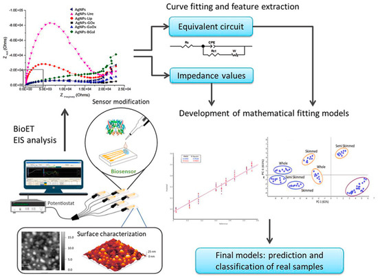 Schematic overview of a AgNP-modified impedimetric bioelectronic tongue for dairy analysis. Figure reprinted from reference [66] (with permission).