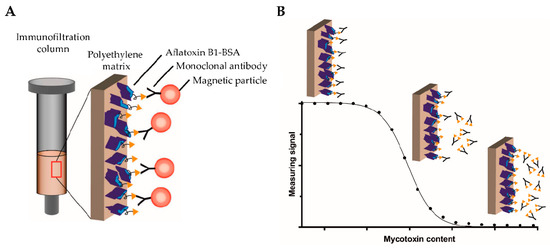 Chematic overview of the competitive magnetic immunodetection of aflatoxin B1. (A) Aflatoxin B1-BSA mycotoxin conjugate with bound biotinylated monoclonal antibodies targeting Aflatoxin B1 inside a inmunofiltration column; (B) Analytical signal obtained in the presence of mycotoxin Aflatoxin B1, the higher mycotoxin content the lower magnetic signal. Figure reprinted from Ref. [86].