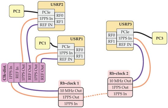 Tight synchronization is necessary to achieve the TDMA structure. A one-pulse-per-second (1PPS) synchronization signal is distributed to all radios, as well as a stable 10 reference clock. Depending on the scenario, either synchronized Rubidium clocks or a GPS can be used to discipline the onboard clock and synchronize the triggers. For high-accuracy sensing measurements, rubidium clocks are the preferred choice, we are using SRS FS725 and FS740 (Stanford Research Systems Inc., Sunnyvale, CA, USA).