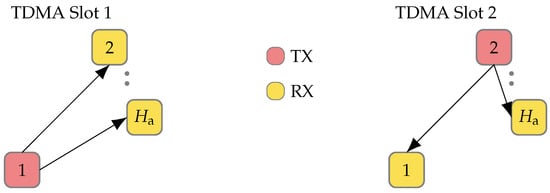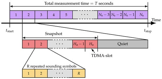 Designed for multilink channel sounding, the channel sounder records and stores all conceivable link combinations between antennas. To avoid interference among links, a TDMA strategy is employed. Each antenna is assigned a unique time slot for signal transmission, during which the remaining antennas are set to receive mode. Figure 2 provides a visual representation of this TDMA structure. As a reference signal, the transmit unit uses a Zadoff–Chu sequence []. The signal is configured as an orthogonal frequency-division multiplexing (OFDM) symbol with Zadoff–Chu samples assigned to subcarriers []. The sounding system also allows for the nullification of a specified number of carriers at the spectrum’s edges, thus providing flexibility in bandwidth utilization. The channel sounder captures and streams the raw complex samples directly to the disk on the host computer for subsequent offline postprocessing, which may include symbol averaging.