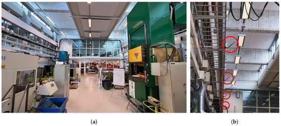 The environment for our measurement campaign can be described by a typical industry hall for metal work, e.g., metal lathe, metal cutting. The dimensions are approximately 30 m × 11 m × 8 m (L × W × H), see Figure 5a. There are many metal objects and pieces of machinery that make for a rich wireless environment. Twelve static, frequency coherent, and distributed antennas were divided equally on each long side of the room, approximately 4 above the floor and separated by 4 ; see Figure 5b. The infrastructure antennas were tilted approximately 45 degrees to obtain better coverage of the floor level area while strong reflections from the walls directly behind them were avoided. The free-space radiation pattern of the antennas is omnidirectional in cross section, but this will of course not be true as soon as it is attached to the metal structure and other objects close to its proximity. However, as previously mentioned in Section 4, we save and evaluate the radio channel, which is the wireless propagation channel influenced by the antenna radiation pattern. During the measurements, the facility was used as usual, with students working on projects and people moving around.