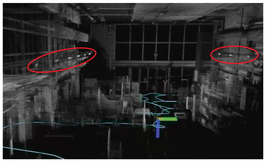 In our case, all measurements were performed indoors, which ruled out a GNSS solution. Therefore, a combination of a lidar sensor (Ouster OS-Dome 128, Ouster Inc., San Francisco, CA, USA) and an IMU (Microstrain 3DM-GX5-25 (AHRS), Microstrain by HBK, Williston, VT, USA) was used to track the odometry of active and passive users. The sensors were connected to a laptop running Ubuntu 20.04 and the Robot Operating System (ROS) [] Noetic. All raw sensor messages were saved on disk to allow for the evaluation of different standard SLAM algorithms. In this work, we used the open-source algorithm FAST-LIO2; see [] for details. The sensors were mounted on a robot to track its position and orientation. During each measured scenario, a new map was constructed as the robot moved. Then, all maps were merged to obtain a single coordinate and reference system. At the mounting point on each of the distributed antennas, we put reflective tape to allow for the easier localization of the antennas on the map; see Figure 6.