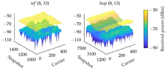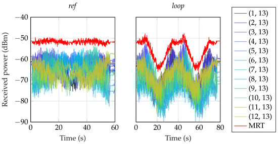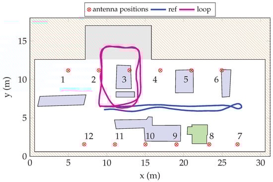 In this study, the moving agent traversed various paths to simulate conditions relevant to robotics or IoT devices in an industrial setting. Each path was traversed multiple times to ensure a robust statistical foundation for channel evaluations. This repetition also facilitates preliminary assessments of data-driven methodologies and machine-learning techniques based on different scenario realizations. All scenarios originated from a fixed position within the environment. For conciseness, this paper focuses on two primary scenarios, henceforth referred to as ref and loop; see Figure 7, which collectively covers critical conditions such as NLoS and LoS links.
