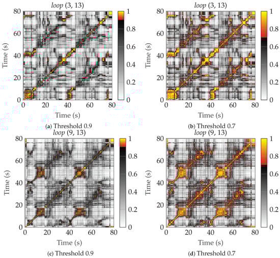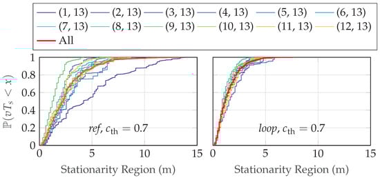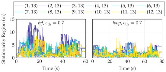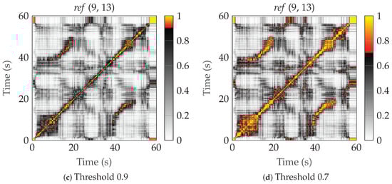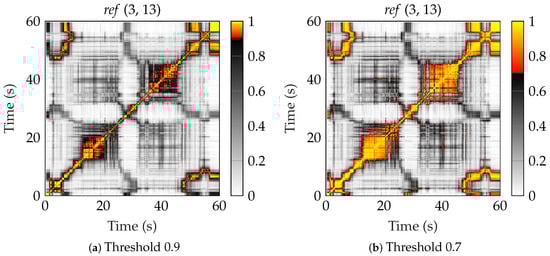where a threshold is defined. From , the (time-varying) stationarity time, , can be estimated as the width of the region around the diagonal. In [], the threshold was somewhat randomly chosen as 0.9. As seen in Figure 10 and Figure 11, we select two (at random) links from the two scenarios ref and loop. We have also plotted how the regions would grow if instead.