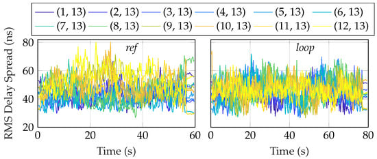 In Figure 8, two representative plots show the channel hardening effect from using distributed antennas; there are no more really deep fading dips. In the ref scenario, we achieved an average array gain of dB. In the loop scenario, the average array gain was dB. When we averaged all subcarriers, the results were similar, as shown in Figure 9. In the loop scenario, there were still variations in the received power levels in the order of 10 dB, and essentially all antennas experienced NLoS conditions at time 20 and 58 . However, despite the challenging propagation conditions, fading levels were small and the received power levels reasonably large. The key takeaway from these results is that there is much to gain from distributing antennas to combat small-scale and large-scale fading which enables reliable communication in challenging environments.