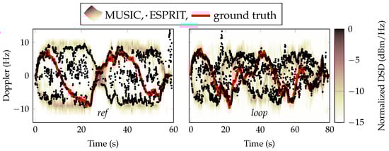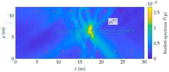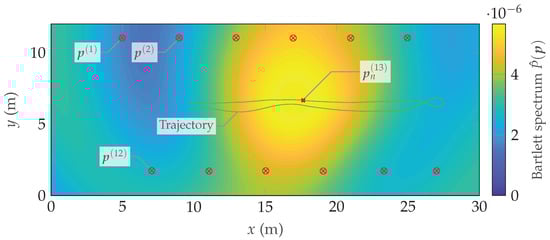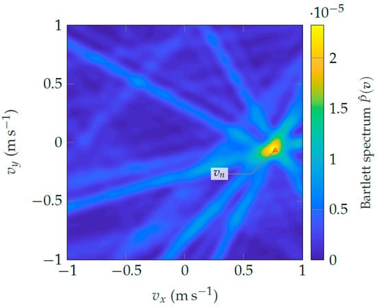 For multiple parameter estimation, Equation (A1) can be used with a stacked vector of parameterized array responses. In the case of our Doppler-delay Bartlett beamformer, we thus choose and likewise, we stack the received signal matrix into a vector , where we use only of such vectors to compute Equation (A2). Noting that , we formulate the Doppler-delay Bartlett spectrum for a single antenna h as follows: