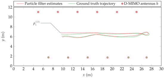 We consider transceiver units distributed in the environment, and their positions are given as , with . In our setup, each transceiver unit supports two independent radio frequency (RF) chains, each connected to a single omnidirectional antenna. It should be noted that a switched—possibly distributed—array can also be connected to the RF chains for even larger setups. In the following signal model, we limit ourselves to the single antenna case for the sake of brevity in notation, but it can easily be extended to the switched array channel sounding system. The th unit represents the mobile agent, and the other units indexed by are the single antenna anchors at known positions. At each time, the th unit acts as a transmitter and emits a periodic signal , and the other units with act as receivers. Signals are represented by their complex envelopes with respect to a center frequency . The signal received at the h th antenna at the discrete observation time n reads