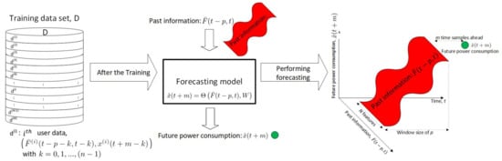 In (1), the DNN model, , forecasts future load consumption, , with m time samples ahead. W is the parameter set of , which needs to be optimized with respect to the prediction accuracy. is the noise residual at time . in (2) is the past information set, which is windowed by a time series between the current time, t, to the past, p, samples of time. with denotes the forecasting feature vector which contains the forecasting feature, with , such as past weather information, past climate information, past seasonal information, user information and building information. is the past load consumption. Both and are correlated to the future load consumption. Therefore, , containing both and , is used to forecast .