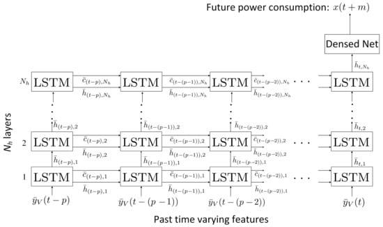 The LSTM network is suitable for time-series predictions since it benefits from long-term memory cells []. The LSTM network in Figure 4 is developed to forecast future load consumption, , with m time units ahead, when the past time-varying features, , ,… and , are given. p denotes the number of temporal lags. The LSTM network consists of layers: an input layer which feeds in the past time-varying features in multi-dimensions, an LSTM layer with neurons and a dense net which determines at the last layer. Each LSTM neuron is fed with past time-varying features.