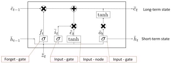 Figure 5 illustrates the computations of how the LSTM neuron manipulates the previous and the future short- and long-term states. To simplify the state expression, the hidden layer index is omitted. The previous and future short-term states are denoted as and , respectively; the previous and future long-term states are denoted as and , respectively. The figure shows that the LSTM neuron consists of a main connected layer and three gate controller layers. The upper layer involves a control state which computes the future long-term state, , by analysing the current input gate, , previous short-term state, , and previous long-term state, . The lower layer involves with the forget gate, with the input gate, , with the input node and with the output gate. The LSTM states are changed by the three gate operations, such as by removing, writing or reading. The computations for , , , , and are performed by (17a) to (17f), respectively: