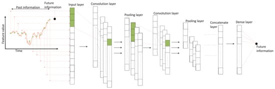 The CNN head in Figure 7 consists of an input layer, several convolution layers, several pooling layers, a concatenate layer and a dense layer. The input layer feeds in the time-varying feature, . The convolution layer extracts important information from . Each convolution layer consists of multiple sliding windows which scan input time series. The sliding window extracts useful information from the time series by capturing repeated patterns at different regions of the time series. Since the sliding windows in the convolution layer focus on the corresponding features, useful information from each feature can be kept. An activation function is applied to the convolution output to learn the nonlinear patterns of each feature. The pooling layer is used after the convolution layer to reduce the time-series size. After several convolutions and pooling operations, the processed time series is concatenated and is passed to the dense layer. The future information is passed to the dense network at the CNN framework in Figure 6 in order to predict the future load consumption, .