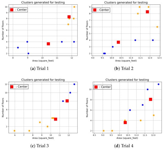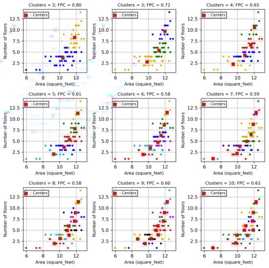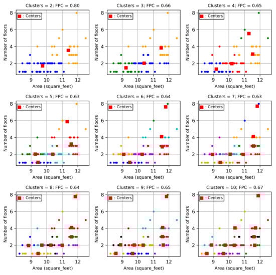 The FCM in Algorithm 1 is used to determine the cluster centres of users with respect to the time-invariant features, namely Building size and Flow count, where the training dataset is used to determine the clusters. The FCM algorithm first determines the optimal number of centres, which achieves the largest fuzzy partition coefficient. The cluster centres with the largest fuzzy partition coefficient are selected and are implemented to select relevant users. The corresponding time-varying data in the same cluster are used to develop the STLF model. The numbers of clusters and the corresponding fuzzy partition coefficients are shown in Figure 8a,b for City-Building and University, respectively. Both figures show that the highest fuzzy partition coefficients can be achieved for both City-Building and University when the numbers of clusters are two. The user data in each cluster are used to develop a STLF model. Hence, two models are developed for these two clusters, respectively.