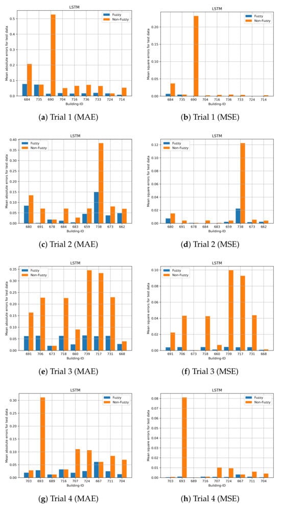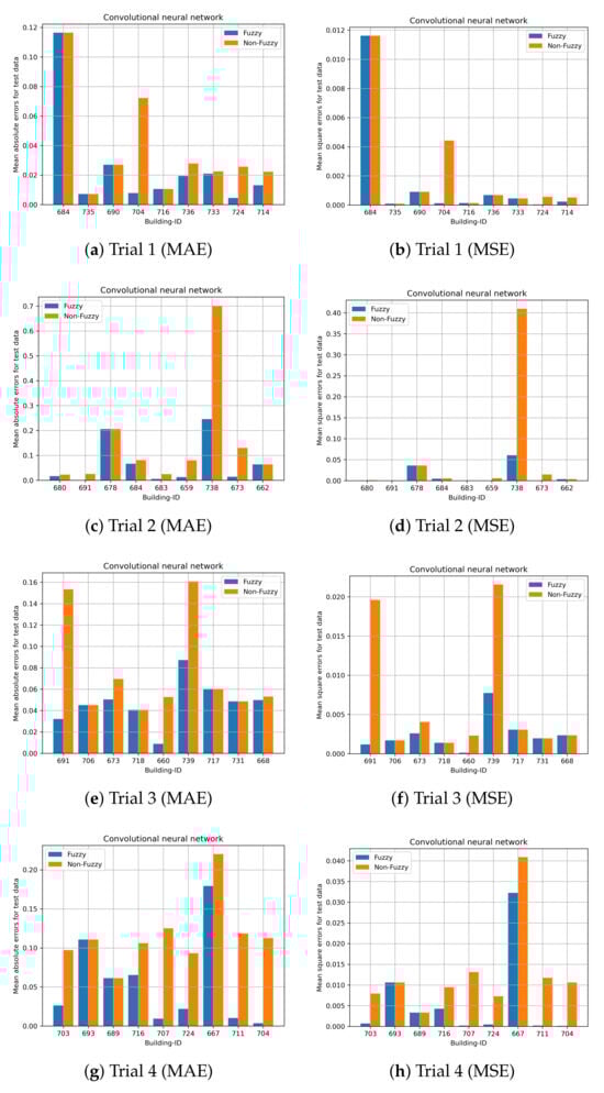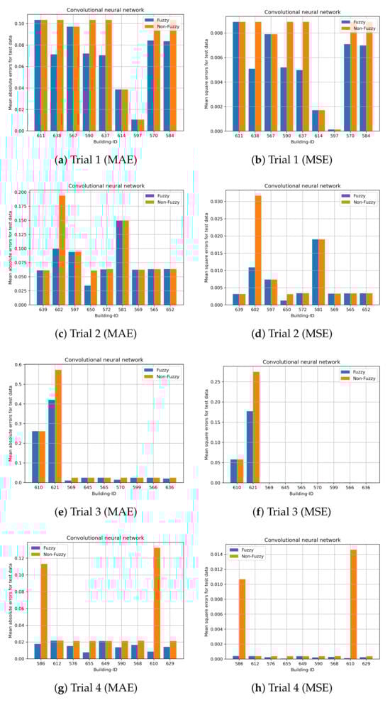 The performance of the proposed fuzzy LSTM and fuzzy CNN paper is evaluated by Miller’s dataset, which is used for developing load consumption predictors or for large building energy anomaly detection [,]. The data used for evaluating the proposed models was collected from two sites, City Building in Cardiff (City-Build) and University College London (University). The data were collected from 2016 to 2017. The data collected in 2016 are used to develop the models and those collected in 2017 are used to validate the prediction capabilities of the models. The numbers of buildings in City-Build and University are 89 and 51, respectively. Hourly meter reading data were captured from power meters installed in the two sites. Each building has one or more power meters measuring load consumption. The total hourly load consumption in a building is the sum of meter readings captured by all the installed meters. The buildings have various purposes, such as education, office and entertainment. The portions of building purposes are summarized in Table 1.