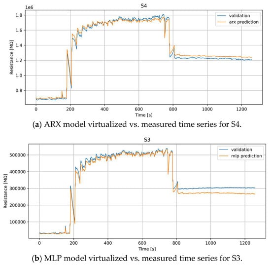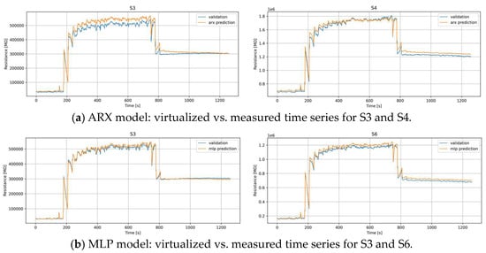for Equations (4) and (8). The models were constructed by varying both the autoregressive and exogenous components, denoted as , spanning orders from 1 to 4, and the best model for each sensor was selected based on the MAE. After model identification, the reconstruction of missing measurements was executed for the validation segment, assuming that a failure occurs from time t = 560 to the end of the dataset. After the reconstruction, the model’s accuracy was evaluated by analyzing its predictive capacity when missing measurements are detected. Figure 5 depicts the reconstructions derived from the two distinct models, ARX and MLP, applied individually to each sensor and compared with the previously validated dataset. A visual analysis of the figures reveals the notable efficacy of both models in accurately predicting the missing data, particularly in scenarios where interruptions occur in the extrapolated data, often induced by sensor faults. It is imperative to underscore that, overall, the MLP model exhibits a superior performance in comparison to the ARX model, with the noteworthy exception observed in the case of sensor S4.