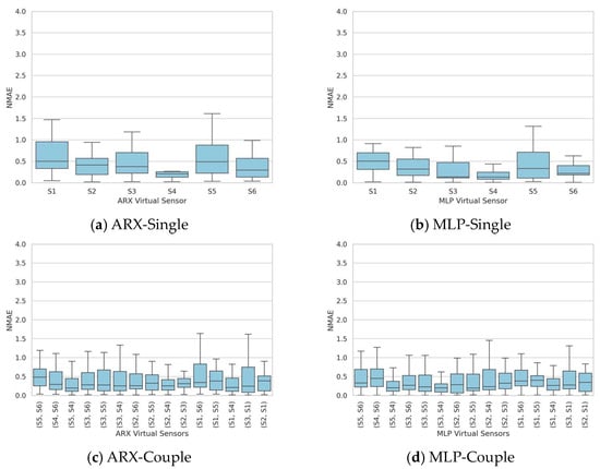 Thus, to improve the robustness of the sensors, the same approach as in the previous section has been implemented here. Three tests were utilized for model identification, and the remaining ones were allocated for validation. Figure 7 presents the obtained NMAE distribution in terms of a boxplot, showing a limited variability in the sensor performances and a median value consistently below 0.5. Notably, S4 demonstrates a superior performance compared to the other sensors, whether the measurements are reconstructed using the ARX model (median of 0.12 and 75th percentile of approximately 0.2) or the MLP model (median of 0.11 and 75th percentile of approximately 0.25).