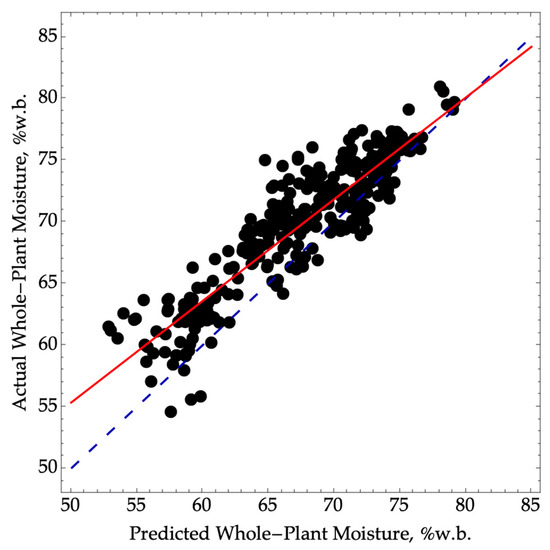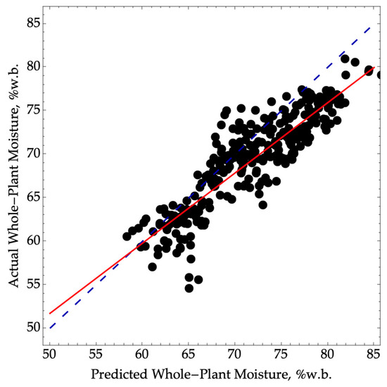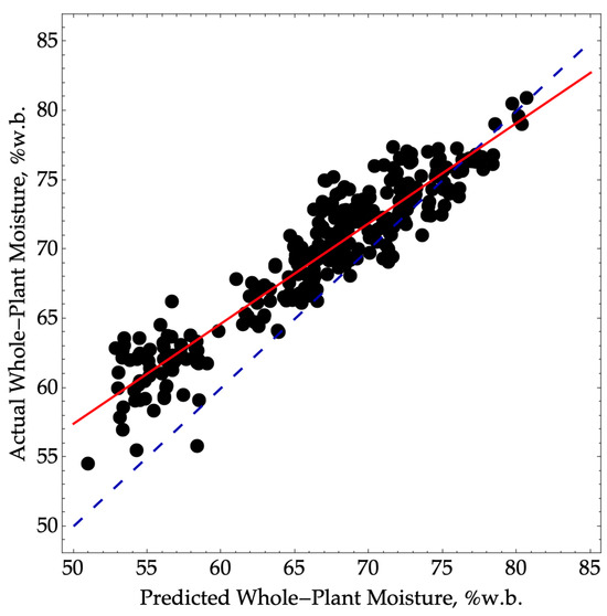 Predicted versus actual whole-plant moisture where oven-dry ear moisture content was used to predict whole-plant moisture using Equation (1). The validation data were collected in the 2022 season (N = 330, RMSEP = 3.9, SEP = 2.7, R2P = 0.88) over a range of moisture from 55 to 81. The dashed blue line represents a 1:1 agreement between actual and predicted values. The solid red line corresponds to a linear model between the actual and predicted values.