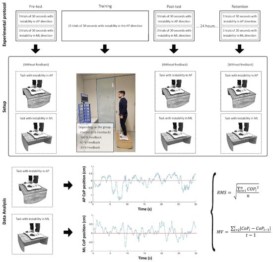 The CoP displacement signals were digitally filtered using a Butterworth low-pass filter with a 12 Hz cut-off frequency. Task performance (both in the ML and AP directions) was assessed using the root mean square of the signal in the direction of seesaw instability. Moreover, to assess the net neuromuscular effort required to perform the task, the mean velocity (MV) in the AP and ML directions was computed depending on whether the task was performed with anteroposterior or mediolateral instability [34]. Therefore, four outcomes, the RMS and MV in AP and ML, were computed for each of the time points (i.e., pre-test, post-test, and retention). Note that the RMS and MV in the AP were calculated for the three trials in which participants performed the task with instability in the AP, whereas the RMS and MV in the ML were calculated for the three trials with instability in that direction. Since three trials were performed in each direction at each time point, the mean of the three trials was calculated. Thus, the RMS and MV in the AP, as well as the RMS and MV in the ML, were available for pre-test, post-test, and retention. The RMS and MV in the AP were considered the main variables that allowed for the assessment of motor adaptation and learning, while the RMS and MV in the ML allowed for the assessment of the transfer of learning to the same task performed in a different direction of instability.