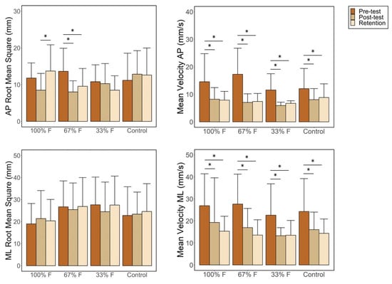 The statistical analysis was performed using SPSS software version 25 (SPSS, Inc., Chicago, IL, USA). Four mixed-model ANOVAs were carried out to check the effect of feedback frequency (four groups: control, 100% feedback, 67% feedback, and 33% feedback) during motor learning (three testing sessions: pre-test, post-test, and retention) on RMS and MV in the AP and ML. The follow-up was performed by pairwise comparisons with Bonferroni’s correction. The significance level was set at p < 0.05 for all the statistical analyses.
