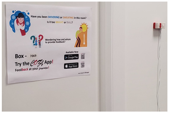 To evaluate the usefulness of the proposed solution, forty-one rooms in five buildings on the UAEU campus were instrumented with the Cozy box (see an example in Figure 2). Of these, six rooms in two of the hostel buildings were single occupancy rooms and five rooms were in the shared labs building E3. The remaining rooms were in the E1 and the C6 buildings. In some of the rooms, the box was deployed on the wall (as shown in Figure 2) whereas in some other rooms, it was deployed on the podium in the room. Feedback was collected anonymously between January 2021 up to February 2022. However, because of COVID-19-related restrictions highlighted in Section 5, gathering regular feedback was a significant challenge. Since the feedback collected is anonymous, it is not possible to identify the individual user who gave the feedback. It is possible to identify the location from where data is gathered since the infrastructure data (box measurements) as well as the feedback data (from the Cozy app) is linked to a specific location. Classrooms are separated for male and female sections within the UAEU campus and therefore, depending on the location from where data is gathered, it is possible to identify the link between each feedback and gender. The majority of the respondents were University students in the age bracket of 18–25 years.