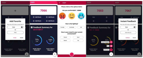 Selecting a box number by clicking on it brings it to the top of their favourites list and displays the corresponding room number in the bottom half of the screen along with a summary of all responses for that location (second screenshot in Figure 3). To provide feedback, the occupants need to click on the box number which launches the feedback page (third screenshot of Figure 3). As shown on this page, there are three simple questions the occupant needs to answer—one about their thermal comfort (whether they are feeling Hot/Comfortable/Cold) by clicking on the corresponding emoji, their perceived lighting level, and their mood in the current environment. Clicking the ‘tick’ at the bottom of the page sends the feedback data to the backend system and takes them back to the home page of the app where they can see the summary responses for this room based on the feedback data (contributed by them and others) for this room. There is also the option to provide instant feedback (without adding a room). For example, if a student is visiting a non-frequented location and wants to provide feedback (perhaps, one time only) on their comfort level at that location, they can click on ‘Instant Feedback’ (see fourth screenshot in Figure 3. This launches the page shown in screenshot five of Figure 3 wherein the occupant merely needs to scan the location QR-code or enter box ID and answer the same questions as above.
