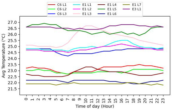 Figure 4 shows the average temperature at the different indoor locations in the UAE university campus. In the vast majority of the cases, the variability at each location is within a 0.5 °C range although the temperatures at some locations varies significantly. As an example, we notice one of the rooms (E1 L7 in Figure 4) consistently operating at 22 °C, another one (E1 L2) operating at °C, and E1 L5 operating between 26–27 °C in the same building.