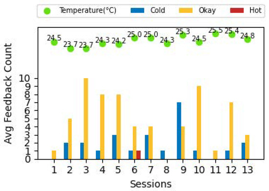 Figure 5 shows the feedback obtained in one of the classrooms in the C6 building over a number of sessions during a semester. This feedback was provided by the students attending the same course at the same time on two different days of the week. The green dots overlaid on the bars indicate the average temperature recorded in the classroom during the session. Observe that in the vast majority of the cases the occupants are comfortable in this room. The temperature range for the ‘Okay’ feedback varies from 23.7 to 25.5 °C. Given that the majority of occupants are comfortable at a wide range of temperatures, from an energy efficiency perspective, it may be prudent to set the temperature to a higher set point in this case which would mean a reduced need for cooling translating to a corresponding decrease in the energy consumption, associated cost, and CO2 emissions.
