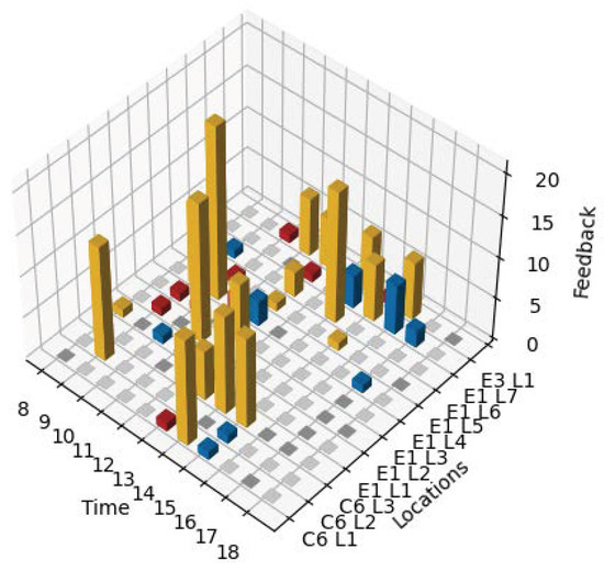 Figure 6 shows the occupant feedback at different times across different locations. For each location, the bar represents majority feedback during the hour. The amber, red, and blue bars indicate the occupant feedback to be comfortable, hot, and cold, respectively. The empty spaces indicate hours when no feedback was received. This could be either due to no classes taking place at the location during that time or no feedback being received. As evident from Figure 6, we observe varying comfort levels in the different locations and also varying comfort levels at the same location at different times. In general, whilst the majority of feedback data in Figure 6 indicates that the occupants are comfortable, there are several locations where the occupants reported being cold. For example, in the case of location E1 L7, there are several feedback points indicating cold. This could potentially be attributed to a low average temperature at this location (around 22 °C as seen from Figure 4). The varying feedback at different times at the same location could be attributed to occupants varying across the same shared space. We also observe that there are very few locations where the occupants reported being hot. This seems to suggest that over-cooling is relatively more dominant than the overheating problem. Overall, the observations from Figure 6 reinforce that a single setting may not be the best choice at all times and that there is a need for regular reassessment and adaptation.