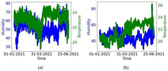 Figure 8 shows an example of the benefit of the proposed system (relying on infrastructure measurements) for a couple of rooms in the CIT building. The figures show the temperature (green points) and humidity (blue points) in these rooms. As evident from these figures, the average temperature range in these rooms in the first half of both figures was on the lower side. The facilities management team was subsequently notified about this which triggered a control resulting in a subsequent reduction in cooling in these premises as evident from the temperatures in the second half of these figures. As it stands, only aggregate level building energy consumption data is captured by the facilities management team with no infrastructure support available for sub-metering individual locations and connected loads. This building comprises a variety of locations such as classrooms, faculty offices, meeting rooms, auditoriums, computing labs, IT equipment rooms, student common rooms, and large open spaces. Given the lack of sub-metering, it is difficult to quantify the precise energy savings that could be achieved with the Cozy pilot deployment. Publicly available estimates such as [32,33] indicate that around 5–10 percent energy could be saved through increasing the temperature set point by a degree. In comparison to these, even if we are to assume relatively conservative savings percentages from deployment of the proposed solution, this could potentially translate to substantial savings over a large number of rooms/buildings over a long period of time. In the context of this study where the majority of our boxes were deployed, the premises are cooled by fans circulating cold air from the chill water fed from a chill water plant. Energy is used during the production of chilled water, by the pumps circulating the chilled water through the pipes, and by the above-mentioned fan units which circulate the cooled air into the rooms. Cooling in this building can be tailored by adjusting the fan speed through the building management system (BMS). The fan speeds can be set to low, medium, or high mode to regulate air flow. Assuming an energy consumption of 3 kWh, 4 kWh, and 5 kWh per day in these three modes and that fan speeds at each mode result in a degree Celcius difference in the room temperature, a reduction in cooling by switching to a lower mode could potentially yield 1–2 kWh/day per fan unit at a location. There are numerous such fan units in this building (100+). Even if we are able to reduce cooling by a degree or two at half of these locations, this could yield savings in the range of 50–100 kWh/day on average. Accumulating such savings over a large number of locations could yield substantial savings over time.