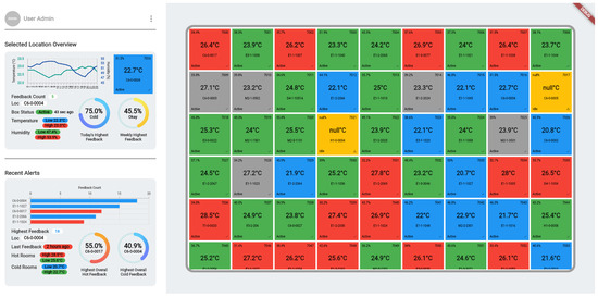 In addition to providing insights for the occupants on how others are feeling about the room (bottom half of the second screenshot in Figure 3), it could also be beneficial to provide insights for the facilities managers to help them identify rooms that require their attention even before occupants start complaining. Figure 9 shows an example of a dashboard under development (not yet deployed) for the building manager which relies on both infrastructural measurements such as those provided by the Cozy box and on occupant feedback. Each cell in the dashboard shows the location information, status of the box in that location, and values of temperature and humidity at the location. These are based on the real data collected from these locations. The colour code of a room is supposed to visually inform the building manager whether occupants in a room are Hot (Red), Cold (Blue), or Comfortable (Green) based on their feedback (currently based on synthetic data which in future could use actual feedback data). It should be noted that this would be based on summary statistics over multiple feedback data points rather than an individual one. For example, if the majority of responses over a time window indicate ‘Cold’, the cell corresponding to this location would be coloured Blue. A grey cell indicates absence of feedback from a location which could prompt the facilities manager to adjust for a lower cooling in order to maximise energy savings and an amber coloured cell indicates a box that is not reporting data. Selecting a cell shows the summary statistics for that location as seen on the block on the top left of this figure. Such a system would offer the potential for the facilities manager to engage in proactive management for timely resolution of over-heating/over-cooling issues facing the occupants. Whilst traditional systems may have access to infrastructural measurements, in the absence of occupant feedback, they will not be able to know if there is a problem. The proposed solution could therefore be a tool to empower both the occupants as well as the facilities managers.
