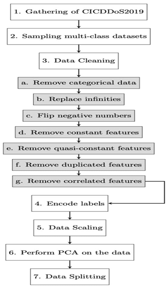 In our research, we conducted a thorough pre-processing of the CICDDoS2019 dataset to extract and refine relevant features essential for our model’s performance. This pre-processing phase was a critical step to ensure the accuracy and reliability of our results. It involved several key phases, including data gathering, sampling, data cleaning, feature selection, label encoding, normalization, and principal component analysis (PCA). Each of these steps was meticulously executed to enhance the quality of the dataset and prepare it for subsequent model development.