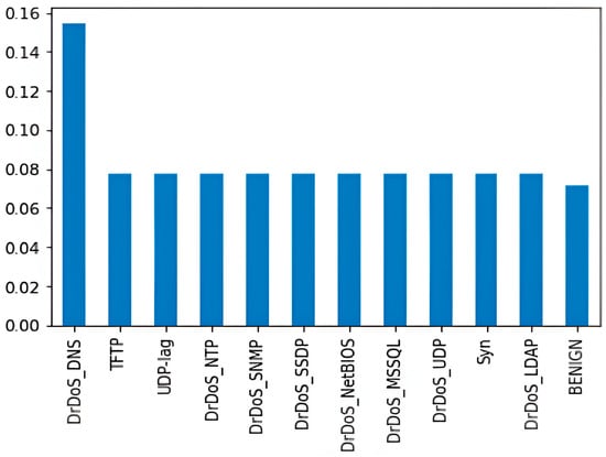 The ‘WebDDoS’ class, with a significantly smaller sample size, is removed. Table 3 and Figure 2 illustrate the updated class distribution after sampling.