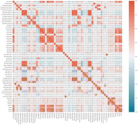 Columns with the ‘object’ data type, representing categorical features, are excluded from the dataset. These columns include ‘Flow ID’, ‘Source IP’, ‘Source Port’, ‘Destination IP’, ‘Destination Port’, ‘Protocol’, ‘Timestamp’, ‘SimillarHTTP’, and ‘Inbound’, reducing the column count from 88 to 78.