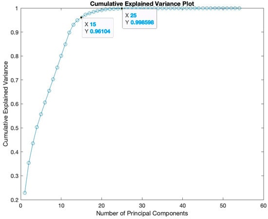 To enhance computational efficiency and mitigate the risk of overfitting, PCA-based pre-processing techniques were employed in the proposed study. The original 41 features were transformed into a set of uncorrelated principal components using Principal Component Analysis (PCA). The decision to utilize PCA was supported by a comprehensive analysis depicted in the cumulative explained variance plot (refer to Figure 4). This plot illustrates the trade-off between dimensionality reduction and retaining dataset variance. Our aim was to retain at least 95% of the total variance, and based on the cumulative explained variance plot, a specific number of principal components were selected. Notably, the final features for the study include two principal components capturing 35.4% of the variance, four components representing 50.35%, seven components at 65.4%, ten components at 80.05%, 12 components at 89.7%, 19 components at 98%, and 25 components at an impressive 99.8%. This meticulous selection ensures an optimal balance between reducing dimensionality and preserving crucial information in the dataset.