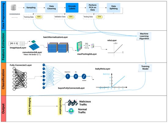 In this section, we elaborate on our methodology for detecting and classifying Distributed Denial of Service (DDoS) attacks in the CICDDOS2019 dataset. Our approach combines Bayesian Machine Learning (ML) and Convolutional Neural Networks (CNN) within a Bayesian Convolutional Neural Network (BaysCNN) model. The BaysCNN model employs a probabilistic approach, which considers the probabilities and uncertainties associated with network traffic patterns, while the CNN component enables the analysis of complex and extensive datasets [19,20].