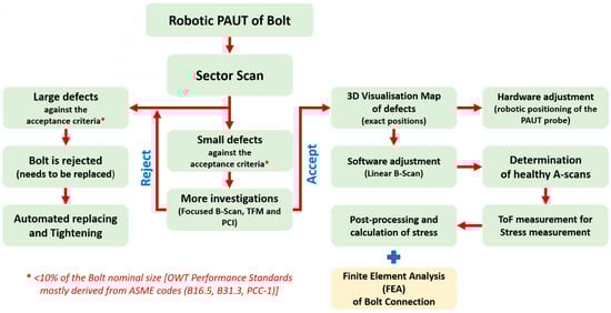 The integration of defect detection and preload measurement is of the utmost importance for the life assessment of engineering assets. Failure to do so can lead to potential influences on the ultrasonic stress measurement and calibration procedure due to the presence of defects. In this paper, and especially with the proposed robotic PAUT approach, additional measurements can be made to provide a more comprehensive compensation. Specifically, the robot’s Z position can be measured accurately, enabling the precise measurement of the couplant gel thickness as a complement to the analytical compensation provided in Equation (7). Furthermore, the robot is equipped with a load cell (force/torque sensor) that ensures constant pressure on the transducer, resulting in a consistent couplant gel thickness. The implementation of advanced post-processing algorithms such as the TFM allows for improved focusing capabilities on critical areas, such as threads, which are typically of significant concern in safety-critical bolts. The methodology used for the robotic PAUT of the bolt is shown in Figure 1 and explained below: