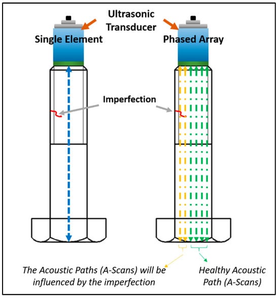 PAUT systems are commonly employed for defect detection [11] and are preferred over single-element transducers due to their general advantages such as wider scanning areas, focusing capability, higher inspection quality, flexibility, and shorter inspection time resulting from rapid visualization [14]. By employing a PAUT system instead of a single-element transducer, it becomes possible to identify potential defects within specific acoustic paths utilised for ToF measurements and subsequently utilise alternative acoustic paths for stress measurement. Additionally, phased-array probes enable various inspections to be conducted from a single location through synthetic aperture focusing and the ability to steer the ultrasonic beam across different angles and positions [15,16,17]. The development of 2D phased-array ultrasonic imaging transducers has also expanded the application of 3D volumetric imaging of components [18], which is particularly beneficial for bolt inspections. Furthermore, advanced post-processing algorithms like the Total Focusing Method (TFM) have made it possible to focus on bolt threads, which are critical areas of concern in OWT bolts. The TFM, employing a delay-and-sum amplitude method with synthetic focusing at pixels in the discretised imaging domain, provides a clearer scanning image of threads and their defects. The high-alloy steel typically used for offshore applications in OWT bolts results in a poor Signal-to-Noise Ratio (SNR), making Phase Coherence Imaging (PCI) another advantage of PAUT. PCI is an amplitude-free synthetic beamforming method that considers phase dispersion at each discrete image point, effectively reducing incoherent noise caused by side lobes, grating lobes, reverberations, and grain noise [19].