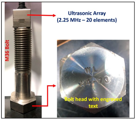 To investigate the impact of small defects that meet the acceptance criteria, an M36 bolt (made of A4-70 stainless steel) was subjected to testing using a 2.25 MHz array from the bottom (Figure 3). The bolt head featured engraved text with a depth of 0.5 mm. These engraved marks are reflected in the backwall echo detected by the ultrasonic waves. In the first test, the bolt was tested under normal conditions (Test #1). However, in the second test, the engraved marks were filled with ultrasonic gel to observe their effect on the ultrasonic echo (Test #2).