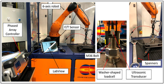 The experimental setup for the robotic PAUT of the bolt is illustrated in Figure 4. The setup comprised an M36 bolt subjected to testing using a 2.25 MHz, 20-element array (Sonatest Ltd., Milton Keynes, UK) with a pitch of 1.2 mm and an elevation of 12 mm. A PEAK LTPA with 32:64 channel inputs and high dynamic range functionality (PEAK NDT, Derby, UK) was used as the phased-array controller. To validate the ultrasonic stress-measurement results, a washer-shaped load cell (BoltSafe, Beuningen, The Netherlands) was employed. The probe was connected to the flange of a 6-axis robot (KUKA Robotics, Augsburg, Germany) using a custom 3D-printed mounting. Additionally, the robot was equipped with a Force/Torque (F/T) sensor, which played a critical role in maintaining consistent pressure on the ultrasonic probe, ensuring improved measurement repeatability. Steel plates were utilised to form the flanged stressed area between the nut and the bolt head. Although the bolt head is not visible in the image as it rests on the robot table beneath the bottom steel plate, the black spanner is attached to it which indicates its position within the setup. The tightening process was performed manually using the spanners. A LabView code was utilised for the PAUT data acquisition and integration of all four key systems: the robot, F/T sensor, washer-shaped load cell, and PAUT system.