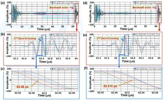 The differences between the A-scans of Test#1 and Test#2 are illustrated in Figure 5, with a focus on the orange plot. Notably, the zero crossing has shifted from 62.48 µs to 62.515 µs, indicating a difference of 35 nanoseconds. It is important to recognize that every 10 nanoseconds corresponds to a 40 MPa discrepancy [28,29]. Therefore, the observed 35 ns difference implies a potential error of up to 140 MPa. However, it is crucial to exercise caution and acknowledge that part of this error may be attributed to variations in the thickness of the couplant layer. To account for this, the disparity between the first and second backwall is taken into consideration, as depicted in Figure 6 and Table 1.