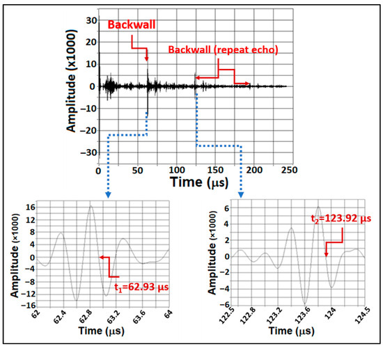 where t2−0 represents the ToF of the second backwall echo in the stress-free material, t1−0 represents the ToF of the first backwall echo in the stress-free material, t2−1 represents the ToF of the second backwall echo in the stressed material, and t1–1 represents the ToF of the first backwall echo in the stressed material.