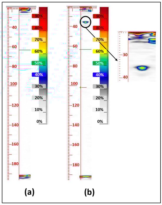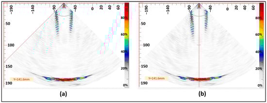 TFM image used to find the defect ((a): no defect detected, (b): SDH was detected).