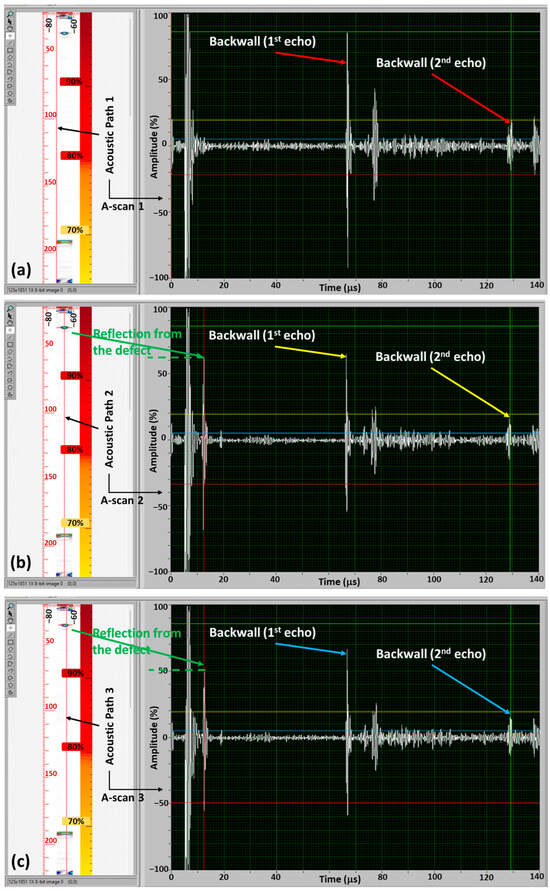 Software adjustment—(a) Acoustic Path 1, which excludes the defect, (b) Acoustic Path 2, which passes through the centre of the defect and (c) Acoustic Path 3, which passes along the edge of the defect.