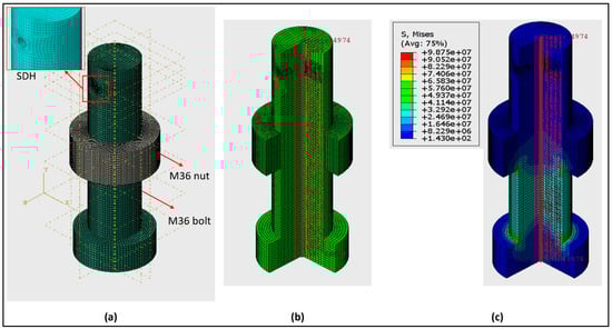 The bolt and nut were modelled as 3D solids using C3D8R elements for meshing in the computational analysis. To simplify the finite element simulation and focus on obtaining the average stress along the central path, the impact of threads was not included. The fixed boundary condition was applied to limit the degrees of freedom on the contact surfaces of the bolt head and nut interacting with the plate and washer. Following our experimental setup, the nut was positioned at a specific distance from the bolt head, and tie contact was established between the surfaces where the bolt and nut interact. A bolt load equivalent to the load cell data was applied to generate stress along the central path. Also, the defect in the bolt was considered in the model during the stress analysis process to evaluate its influence on stress analysis paths.