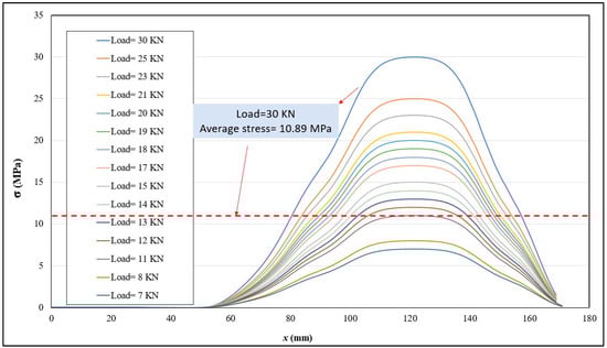 In the experimental setup utilised in this paper, a washer-shaped load cell was employed to measure the applied load and, consequently, the stress. However, a direct comparison between the stress measured by the ultrasonic method and the load cell readings is not possible because the ultrasonic method only provides an average stress measurement. To address this issue, FEA was employed to calculate the average stress for comparison with the ultrasonic results.